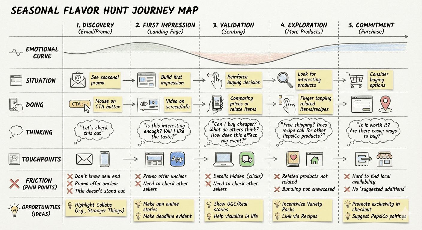 We used journey mapping to align on a focused direction by brainstorming use cases and voting on the most valuable paths for GenZ. We identified three primary journeys: seeking special/limited flavors, event-specific bulk shopping, and desiring direct recommendations from PepsiCo. This framework grounded our ideation in core use cases unique to the brand's potential.