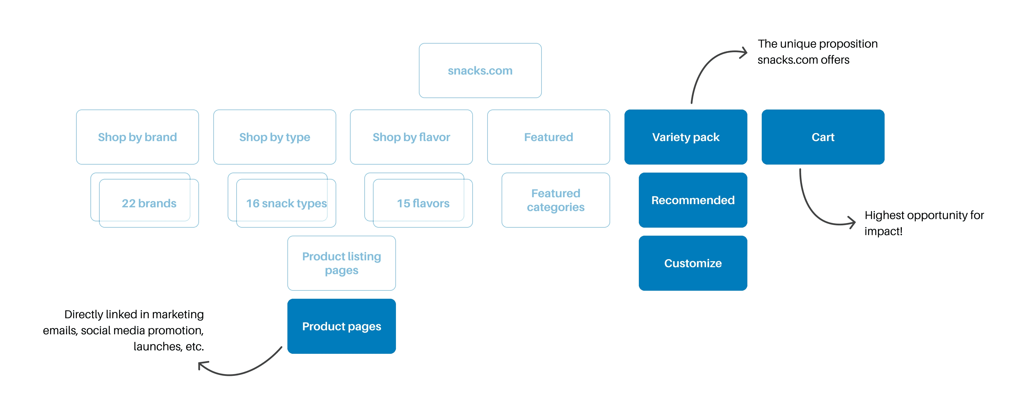 By scoping to the pages with the most traffic (product pages and the cart), and the unique propositions from snacks.com (Variety Packs), we strived to increase revenue from this market.