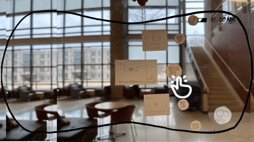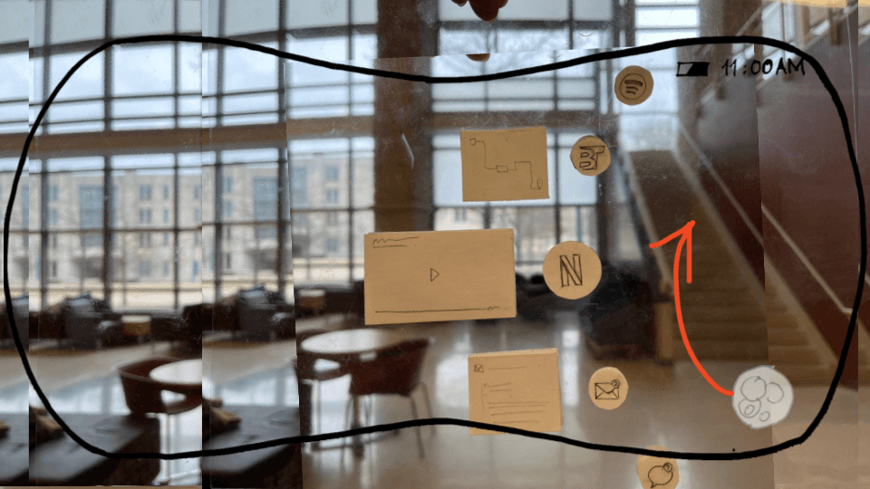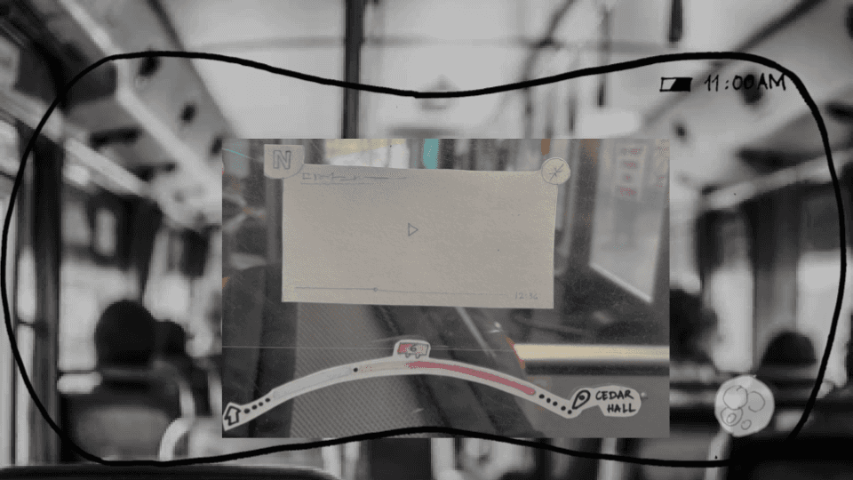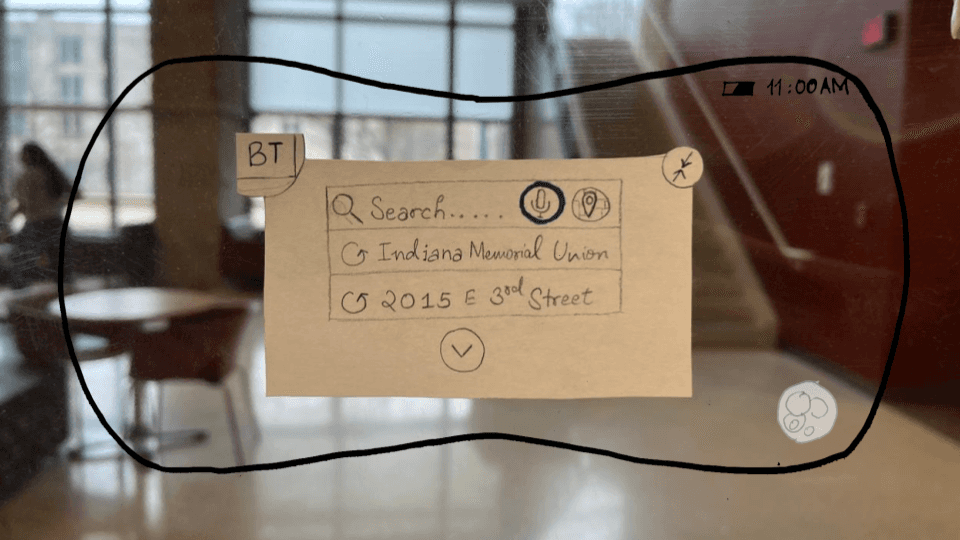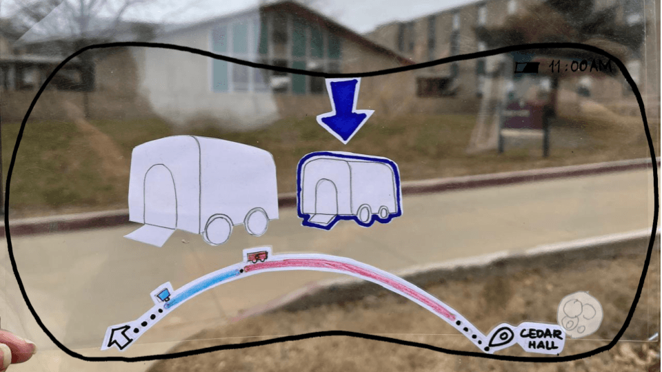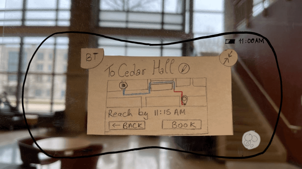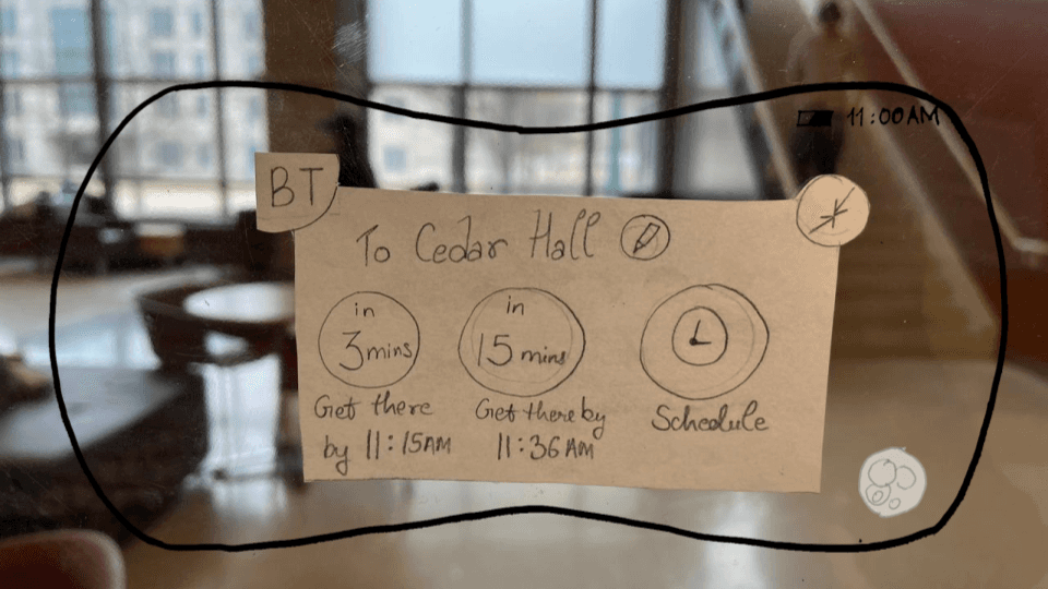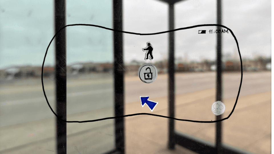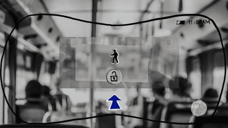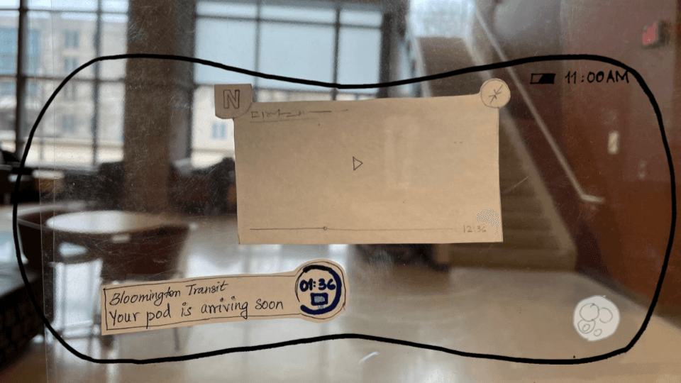 In the future, where all interactions happen on AR devices, the common folks of Bloomington use the city transit app to book a pod that catches up with the bus and allows them to travel within the city. Here, we are trying to show a scenario where a student is using an AR device for his personal use and decides to start his journey to his class.
